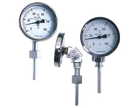 雙金屬溫度計,是一種測量中低溫度的現場檢測儀表。可以直接測量各種生產過程中的-80℃-+500℃范圍內液體蒸汽和氣體介質溫度。工業用雙金屬溫度計主要的元件是一個用兩種或多種金屬片疊壓在一起組成的多層金屬片,利用兩種不同金屬在溫度改變時膨脹程度不同的原理工作的。當溫度發生變化時,感溫器件的自由端隨之發生轉動,帶動細軸上的指針產生角度變化,在標度盤上指示對應的溫度。